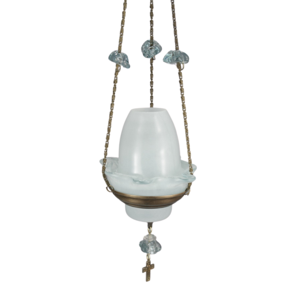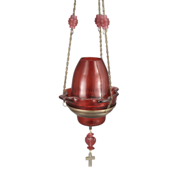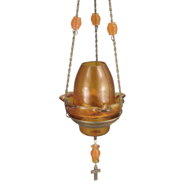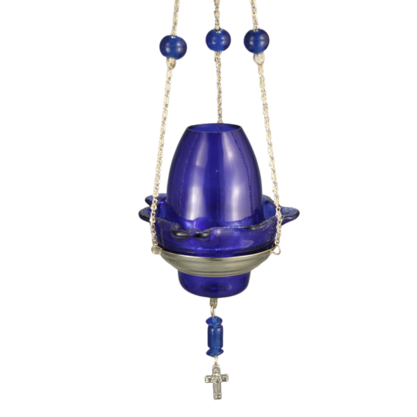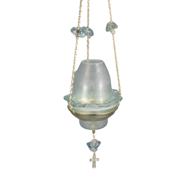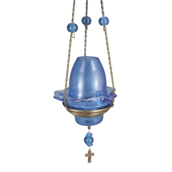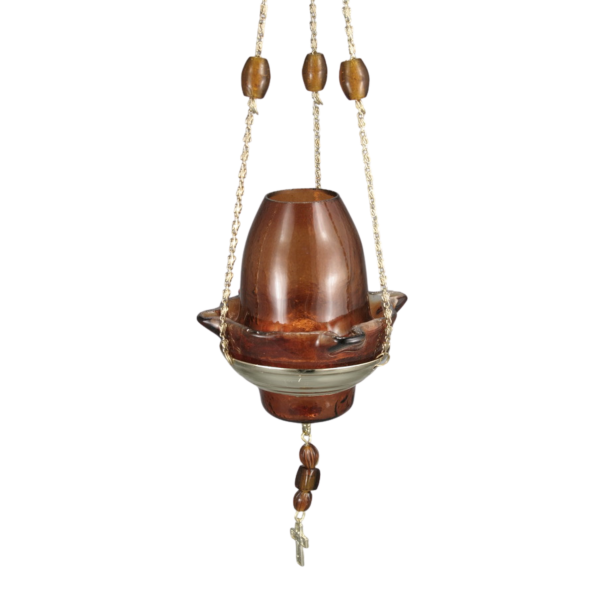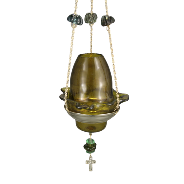 Κρεμαστή καντήλα “λύχνος” από χειροποίητο fusing γυαλί, με αποσπώμενο καπάκι για κλειστή και ασφαλή καύση. Αερίζεται επαρκώς και έτσι δε σβήνει. Η καλύτερη λύση κρεμαστής καντήλας για ομορφιά και ασφάλεια. Συνοδεύεται από ποτηράκι.