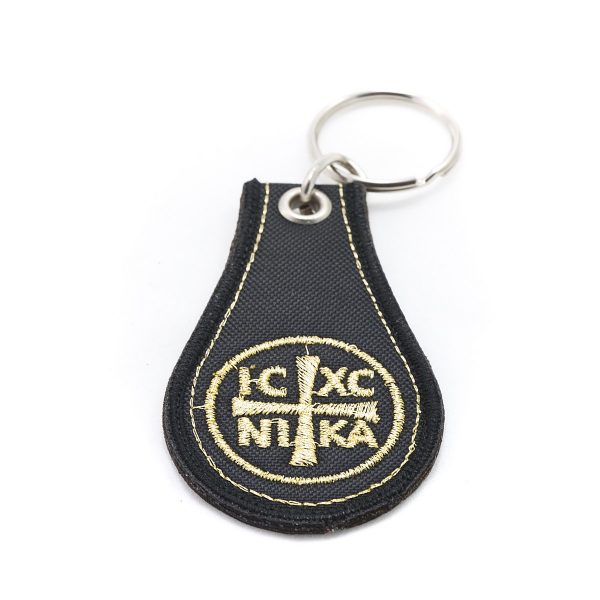 Μπρελόκ από σκληρό ανθεκτικό ύφασμα, δύο όψεων σε μαύρο χρώμα, κεντημένο με χρυσοκλωστή.