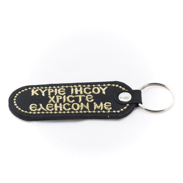 Μπρελόκ από σκληρό ανθεκτικό ύφασμα, δύο όψεων σε μαύρο χρώμα, κεντημένο με χρυσοκλωστή.
