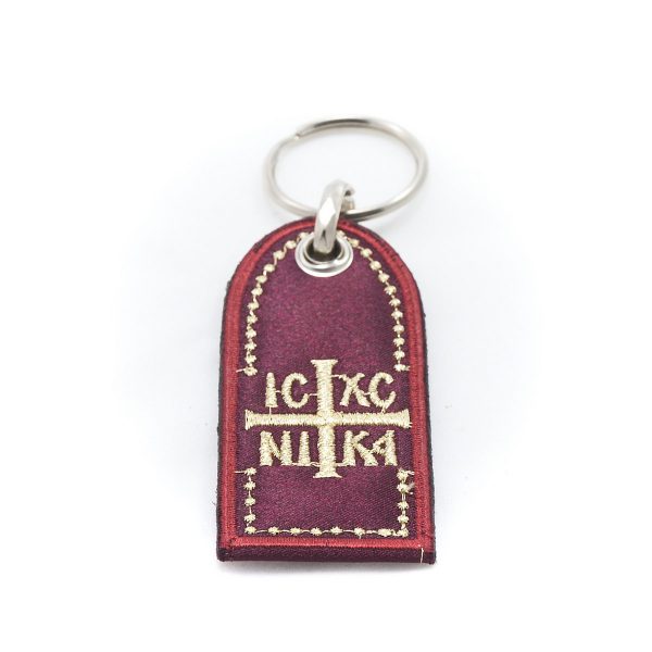 Μπρελόκ από σκληρό ανθεκτικό ύφασμα, δύο όψεων σε βυσσινή χρώμα, κεντημένο με χρυσοκλωστή.